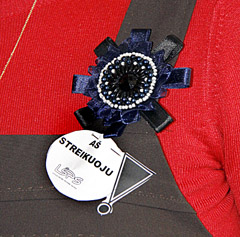 ŽENKLAS: Mokytojai su plakatais į gatvę nėjo – streikavo klasėse prisisegę ženklelius „Aš streikuoju!“