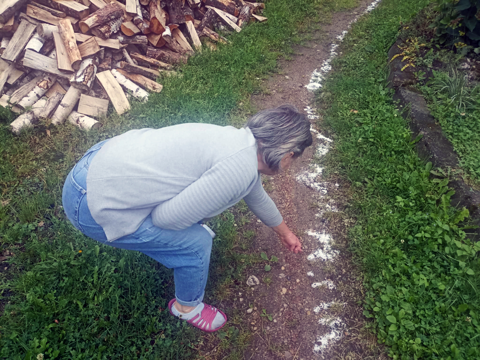 Surinktus šliužus ji supila į lauko tualeto duobę – tik iš ten, anot moters, jie neišropoja. „Supilti šliužai rūgsta, smirsta... Bet ką daryt? Nėra kito būdo. Į konteinerį mesti jų irgi negalima. Sudegintum kokiam kibire, bet kad jie nedegūs“, – guodėsi Rita.