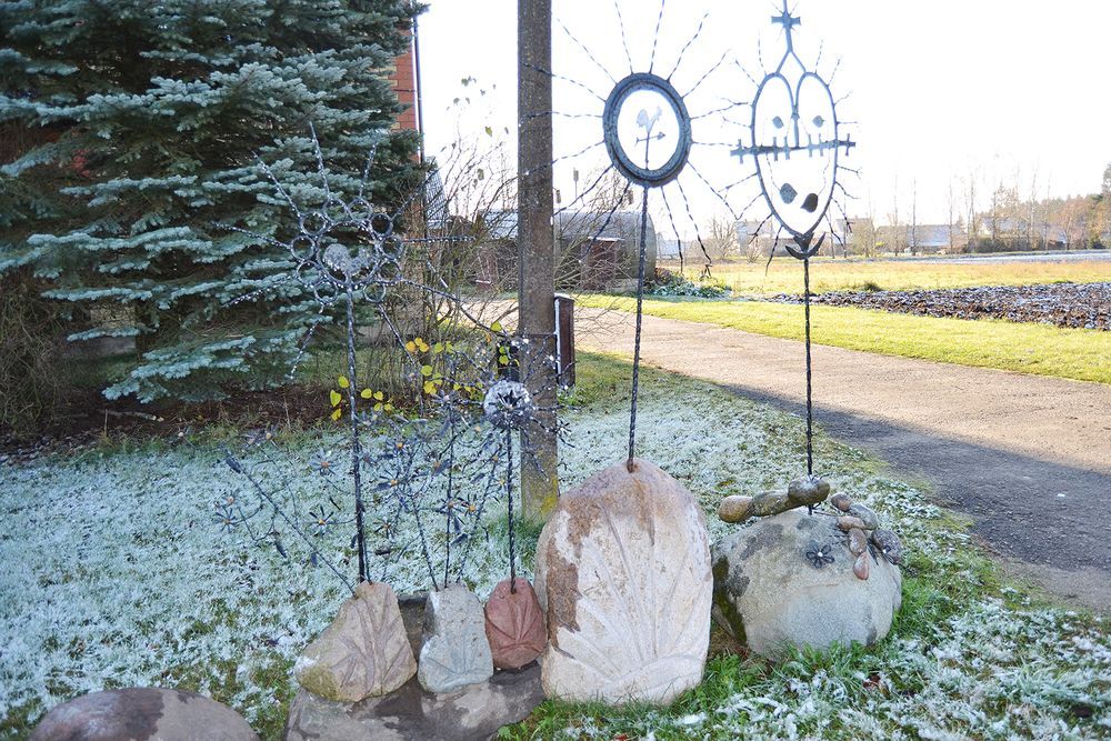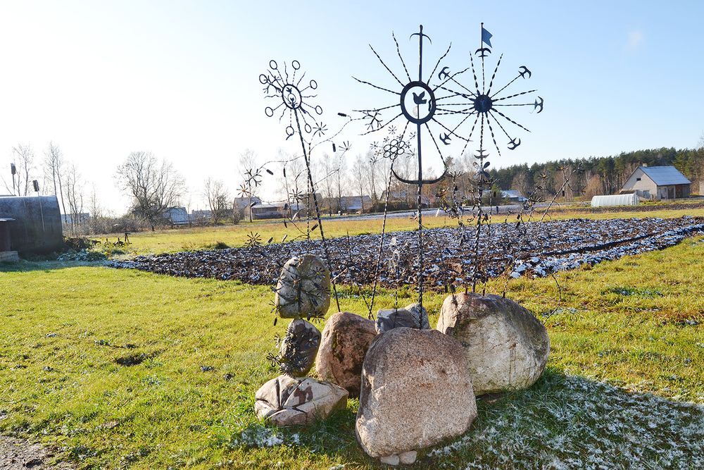 – Akmenų prisirankioju iš krūmynų, pamiškių. O metalas – iš atliekų: vielos, šieno vartytuvų... Pats turiu kalvę, žaizdrą, kaip nujausdamas prieš daugelį metų nusipirkau specialius įrankius. Jie be darbo nebuvo. Kartais ir aš pats, ir sūnus Virginijus kokį reikiamą varžtelį savo ūkio technikai išsitekindavome. Pirmąją saulutę iš metalo susukau prieš 10 metų. Toks sumanymas kilo pavarčius smetoninę kalvystės knygą. Sužavėjo kryžiai, koplytstulpiai. Kodėl pačiam nepabandžius? – pasakoja Mykolas.