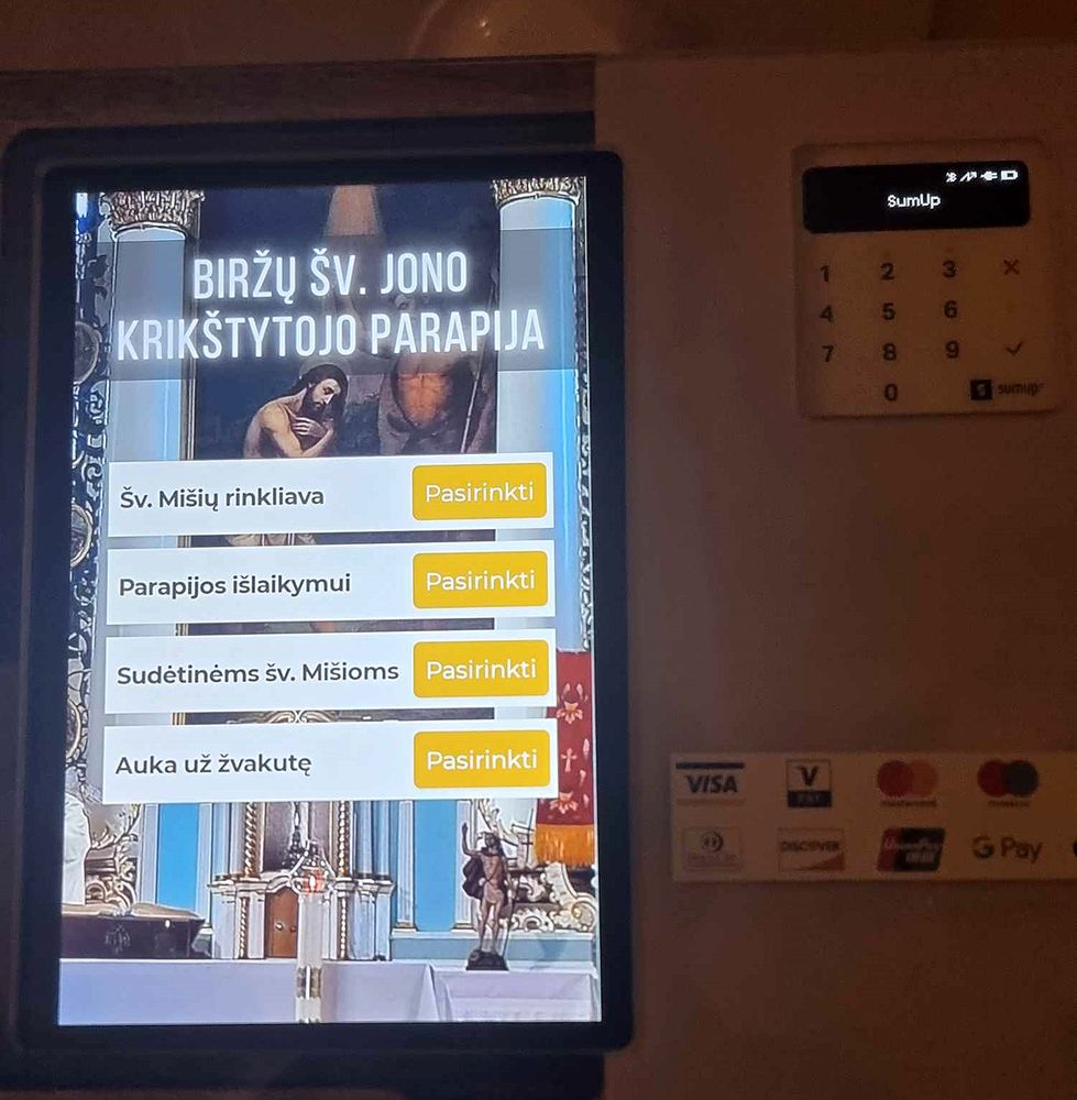 „Atsižvelgdami į vis didėjantį poreikį auką bažnyčioje palikti ne grynaisiais pinigais, bažnyčioje įrengėme banko kortelių skaitytuvą – terminalą. Jame Šv. Mišių rinkliavos aukas, parapijos išlaikymo aukas (pvz. šiluma, elektra) ar aukas už sudėtines Šv. Mišias galima palikti pasinaudojus banko kortele arba jūsų mobiliuoju telefonu“,- tokia naujiena Biržų katalikų bažnyčioje savaitgalį pasidalino klebonas kunigas J. Morkvėnas.