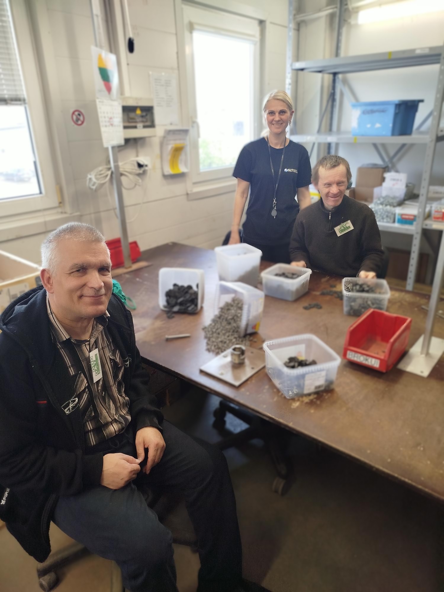VšĮ Biržų rajono socialinių paslaugų centro lankytojai Aurelijus ir Rimantas mokėsi detalių surinkimo UAB „SLT Industrial“.