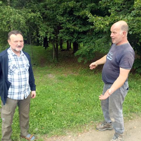 Biržiečiai Pranas Pocius (dešinėje) ir Romas Gendvilas sunerimę: kam A. Dauguviečio parke matuojami medžiai ir kodėl apie atliekamus darbus bei jų kainas niekur neskelbiama?