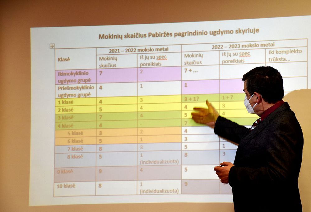 Susirinkimo metu paaiškinta, kad mokykloms leidžiama jungti 1 – 4 klases, tačiau uždraustos jungtinės 5 – 8 bei 9 – 10 klasės. Kadangi valstybės lėšomis nebus finansuojamos mažesnės negu 8 vaikus turinčios klasės, tai jų ir negali likti.