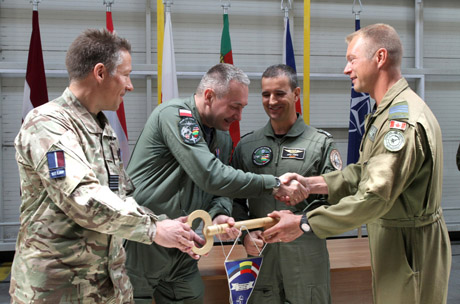 PASIKEITIMAS: Baltijos šalių oro erdvės simbolinį raktą (iš kairės) britų junginio vadas pulkininkas leitenantas Simon Hulme ir lenkų junginio vadas Krzysztof Stobiecki perdavė Portugalijos junginio vadui pulkininkui leitenantui Joo Pires ir Kanados junginio vadui David Pletz.