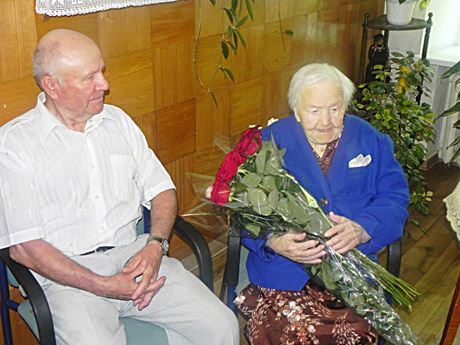 Jadvygute meiliai vadinama gimtuvininkė sveikinimus priiminėjo viso globos namų kolektyvo akivaizdoje, sėdėdama šalia savo sūnaus Ričardo. Moteris globos namuose gyvena septyniolika metų.
