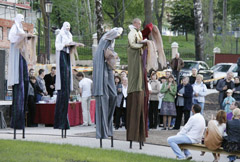 Kojūkininkų grupė iš Kretingos atliko miniatiūrą „Atspindžiai veidrodžiuose“. Jie nuolat iš damų rankų paimdavo vendrodžius ir jais visaip manipuliuodavo, naudojo spalvotus dūmus ir įvairias skraistes. Tokio įspūdingo ūgio ypatos ne tik slankiojo aplink žiūrovus, bet ir šoko pagal smagią muziką.