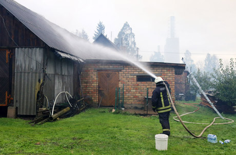 APSAUGA: Gaisravietės pašonėje esančius gyvenamuosius namus bandyta apsaugoti aušinant vandeniu.