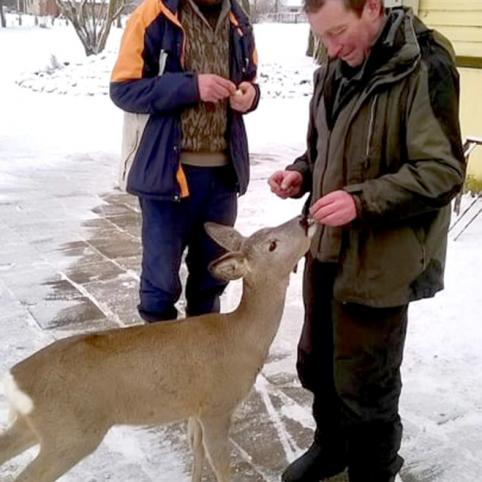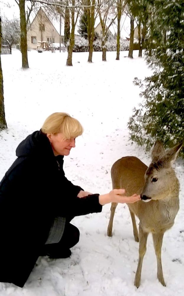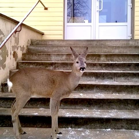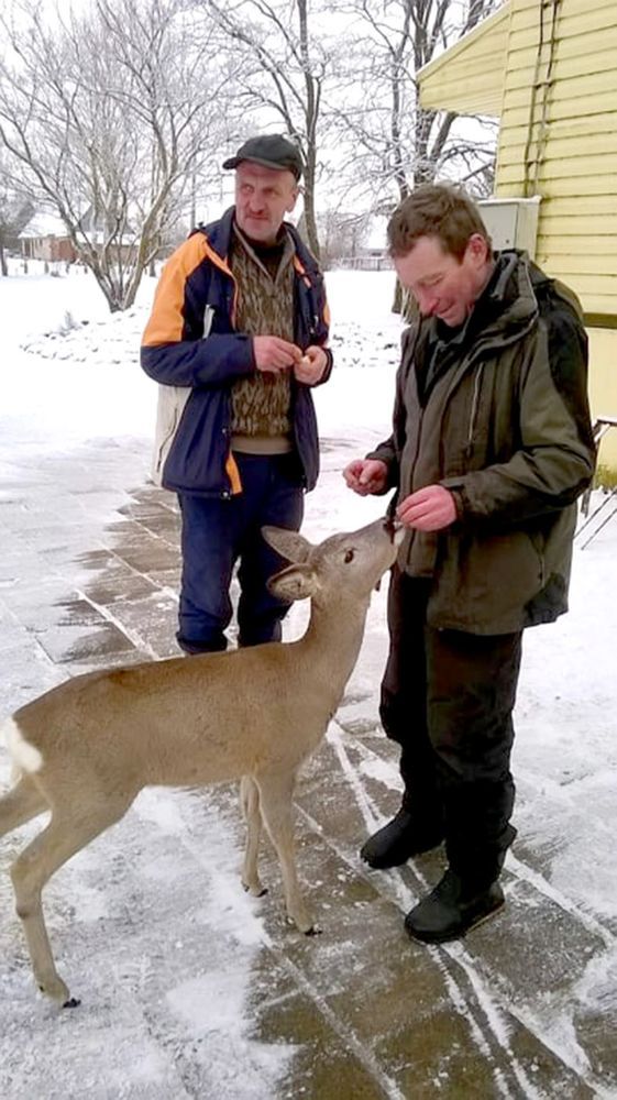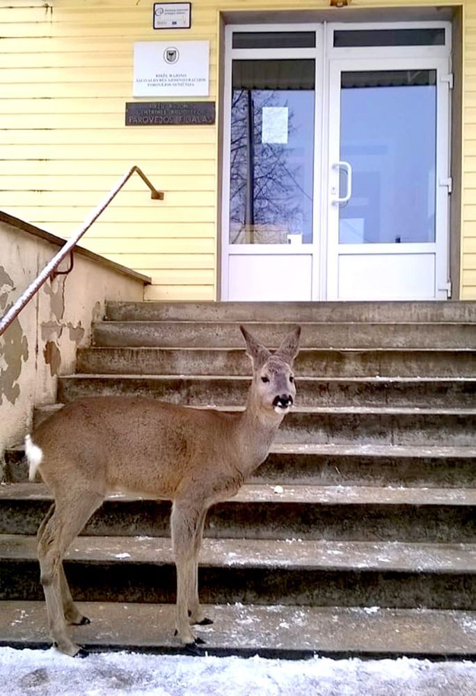 Fotografuota prieš paskelbiant karantiną, kai visi, ir parovėjiečiai, ir stirnaitė buvo lygūs. Be kaukių.