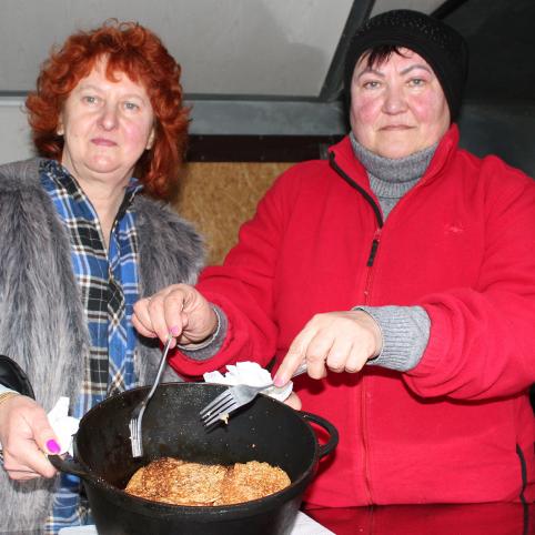 Įkyrus lietus ir gūsingas vėjas žmones nuginė nuo laužo į Kultūros centro vestibiulį. Ugnies kurstyti liko Biržų kultūros centro direktorius Romas Lesevičius. Netoliese savo keliaujančioje virtuvėlėje ant ratų tradicinius rūpaus malimo kvietinius blynus kepė Kirkilų kaimo bendruomenės šeimininkės. Čia pat jos čirškino spirgučius ir ruošėsi patiekti rudenį išvirtą obuolienę. Virduliuose kunkuliavo karšta arbata.