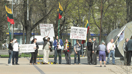 Vakar šiauliečiai skvere prie Savivaldybės surengė piketą su trispalvėmis ir plakatais: „Už kiek pardavėte Lietuvą“, „Neterškite gamtos“.