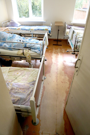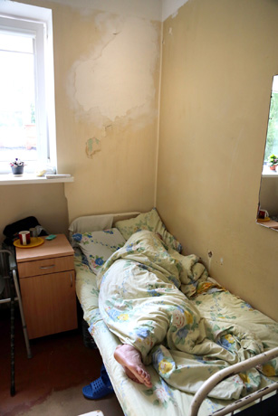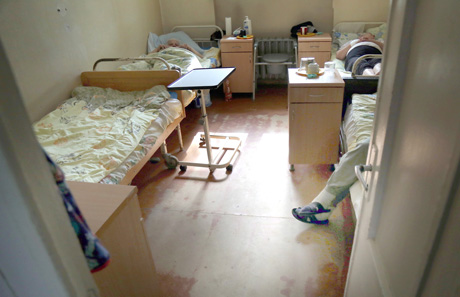 Iš­ma­tų smar­vė. De­jo­nės. Tarp lo­vų – tik siau­ru­tis praė­ji­mas, vi­sa ki­ta erd­vė už­pil­dy­ta lo­vo­mis, ku­rio­se mie­ga, de­juo­ja se­ni ir pu­sam­žiai sun­kiai ser­gan­tys, dau­giau­sia ne­vaikš­tan­tys žmo­nės.
