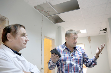 EMO­CI­JOS: Šiau­lių ra­jo­no Ta­ry­bos Kont­ro­lės ko­mi­te­to pir­mi­nin­kas Lais­vū­nas Nei­ma­nas emo­cin­gai ver­ti­no si­tua­ci­ją. Li­go­ni­nės gy­dy­to­jas Mar­ty­nas Po­cius (kai­rė­je) paaiš­ki­no, li­cen­ci­ja atim­ta, nes „hi­gie­ni­nės nor­mos nea­ti­ti­ko“.