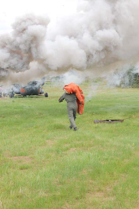 GELBĖJIMAS: Pratybose „Griausmas-2012“ buvo „gelbėjami“ užsidegusio sraigtasparnio Mi-8 keleiviai ir įgula.