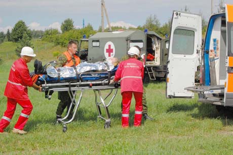 PAGALBA: „Nukentėjusiems“ per „avariją“ į pagalbą atskubėjo medikai.
