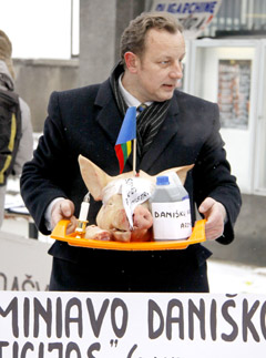 Premjeras sutiktas su kiaulės galva ir plakatais