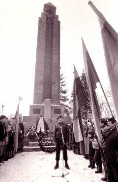 UNIFORMA: Pirmasis Vasario 16— osios minėjimas 1991 metais. A. Ulčinas, grįžęs iš Vilniaus, parlamento ginybos, sakė kalbą Šiauliuose Sukilėlių kalnelyje vykusiame Vasario 16-osios minėjime. Čia jis su uniforma, su kuria dalyvavo parlamento gynime.