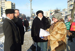 SUSITIKIMAS: Su piketuotojais susitikę (iš kairės) rajono vicemeras Kazimieras Augulis ir rajono Tarybos narys konservatorius Vitolis Januševičius šaltyje ilgai neužsibuvo — piketo dalyvius pakvietė į Savivaldybę. Dešinėje — piketo rengėja Laimutė Šlamienė.