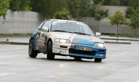 RUNG­TIS: Su­val­dy­ti au­to­mo­bi­lį šla­pio­je sla­lo­mo tra­so­je bu­vo ne­leng­va. Rung­tį at­lie­ka šei­my­ni­nis And­riaus ir Lau­ros Kil­džių eki­pa­žas, vai­ruo­jan­tis „Hon­da CRX“. Šis eki­pa­žas bend­ro­je ra­lio įskai­to­je bu­vo 15-as.