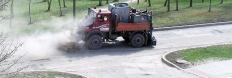 DUOBĖS: P. Mašioto gatvę naujai dangai ruošianti kelininkų mašina važinėjo per duobes, keldama dulkių debesis.