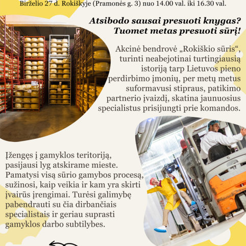 AB „Rokiškio sūris“ taip pat kviečia inžinerinių krypčių studentus bei moksleivius, besidominčius šiomis specialybėmis, į Atvirų durų dieną: bus galimybė susipažinti su įmone, reikalingomis profesijomis ir, galbūt, pasirinkti tolesnę studijų ir profesinę veiklą, susijusią su pieno pramone. Norintieji iš arčiau pamatyti įmonės kasdienybę, susipažinti su jos perspektyvomis ir darbu, kviečiami registruotis iki birželio 23-osios. Čia laukiamas kiekvienas, norintis mokytis ir susieti likimą su Baltijos regiono pieno pramonės lyderiais.