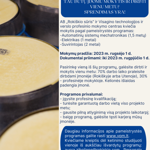 „Rokiškio sūris“ siūlo puikias sąlygas dirbti, mokytis ir tobulėti: pameistrystės programos dėka jos darbuotojai galės mokytis itin aukštus įvertinimus turinčiame Visagino technologijų ir verslo profesinio mokymo centre, įgyti paklausiausias darbo rinkoje profesijas, turėti garantuotą darbą ir studijų metu, ir po jų, tobulėjimo ir tolesnių studijų galimybes.