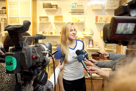 Rūta Meilutytė Šiaulių saldainių fabrike „Rūta“ apžiūrėjo šokolado muziejaus ekspoziciją, susipažino su šokoladinių saldainių gamybos subtilybėmis, net pati bandė sukurti saldainių popierėlio piešinuką.