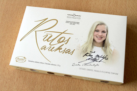 Šviesiai gelsvos spalvos šokoladinių saldainių dėžutė ne tik puošta besišypsančios čempionės Rūtos Meilutytės nuotrauka, ją atidarę pirkėjai ras staigmeną – Rūtos nuotraukomis iliustruotą spalvotą leidinį, kuriame išvardyti svarbiausi plaukikės pasiekimai.
