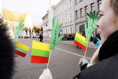 RANKOS: Miesto moksleiviai į minėjimą atsinešė popierines rankas su užrašais „Laisvė“, „Lietuva“, „Nepriklausomybė“.
