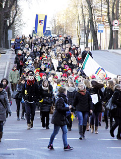 EISENA: Nuo Didždvario gimnazijos į minėjimą prie Savivaldybės atžygiavo spalvinga moksleivių eisena.