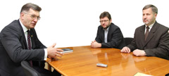 SOCIALDEMOKRATAI: Šiauliuose viešėjęs parlamentaras Algirdas Butkevičius, Lietuvos socialdemokratų partijos pirmininkas, (kairėje) kritiškai kalbėjo apie valstybės valdymo problemas. Diskusijose dalyvavo ir miesto socialdemokratų lyderiai ( iš dešinės) — Seimo nariai Edvardas Žakaris ir Valerijus Simulik.
