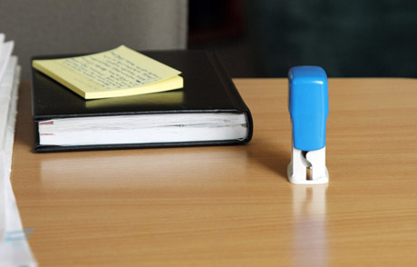 REGALIJOS: Administracijos direktoriaus darbo įrankiai: antspaudas, užrašinė ir lipdukai.