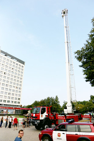 UGNIAGESIAI: Labai didelio susidomėjimo sulaukė ugniagesiai, ne tik demonstravę savo įrangą, bet leidę ją išbandyti.