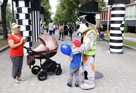 POLICIJA: Prie Dviračių muziejaus pasakų herojai visus kvietė ieškoti lobio, lenktyniauti, dirbtuvėlėse lavinti kūrybiškumą, su visais noriai bendravo policijos simbolis šuniukas Amsis.