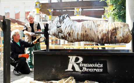 JAUTIS: Vakar „Šiaulių naktyse 2014“ buvo atgaivinta jaučio kepimo tradicija – 200 kg svorio jautis buvo marinuojamas savaitę laiko. „Rimuošės dvaro“ (Radviliškio raj.) kepėjai Vytenis Motiečius ir Anatolijus Kasperuk jį kepė 8 val., vis pasukiodami į foliją įvyniotą mėsą, kad tolygiai iškeptų. Vakare jaučio galėjo paragauti visi norintieji.