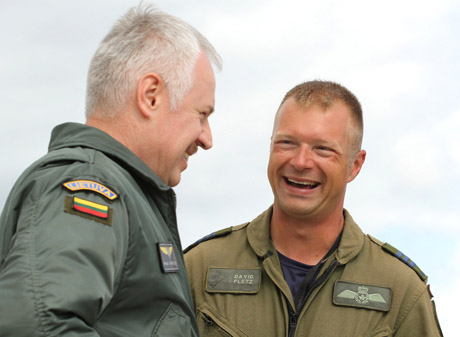 SUTIKIMAS: Vakar tik išlipusį iš naikintuvo Kanados junginio vadą pulkininką leitenantą David Pletz (dešinėje) pasitiko Lietuvos karinių oro pajėgų Aviacijos bazės vadas pulkininkas leitenantas Vidmantas Raklevičius.