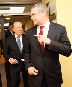 SUSITIKIAMS: Daugiau kaip dvi valandas truko Lietuvos Premjero Andriaus Kubiliaus (kairėje) susitikimas su Rusijos dujų koncerno „Gazprom“ antrinės įmonės „Gazprom export“ generaliniu direktoriumi Aleksandru Medvedevu.