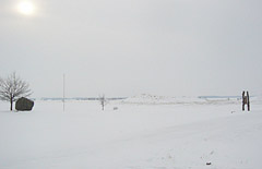 MŪŠIS: Prie sodybos šliejasi Saulės mūšio įamžinimo vietos laukas, kuriame užsnigus matyti akmuo ir lenta.