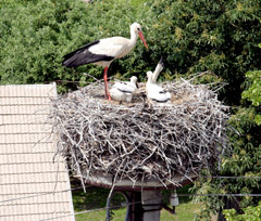 ŠEŠĖLIS: Gandras nuo saulės kaitros jauniklius dengė savo šešėliu. Gandriukai jau kalena snapais.