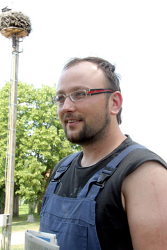 PASTEBĖJIMAS: Ūkininkas Mantas Plakys sako, kad sodybos gandrų pora iki šiol užaugindavo tik po du jauniklius.