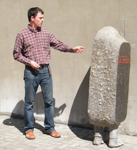 „SARGYBINIS": Šiaulietis akmentašys Kazys Bimba senokai buvo nusižiūrėjęs vietą tarp policijos ir teismo pastatų savo skulptūrai pastatyti. Kūrinį autorius pavadino „Sargybinis“.