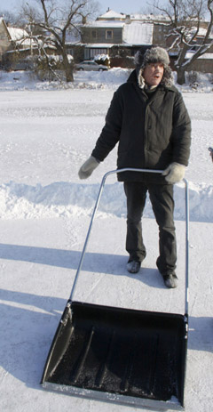 Vyrai darbuojasi jau tris valandas. Ne tik sniegą nuvalo, bet iš jo ir bortelius sukasa, kad būtų žymu, kur čiuožyklos riba.