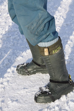 BATAI: Nuo šalčio Adolfą Stafeckį saugo šilti batai, ilgos kojinės. Kad nepaslystų – užsisega specialius diržus.