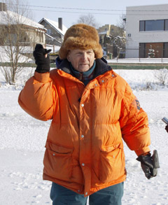 Jį nuo šalčio saugo kailinė kepurė ir šilti batai. Jei sužvarbsta, ant kelių užsismaukia ilgas kojines.