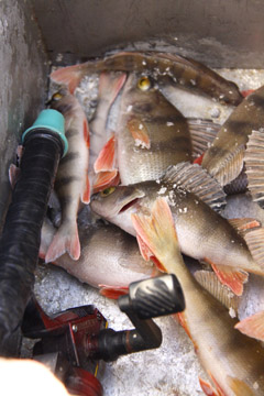 Prityrusio žvejo Adolfo Stafeckio laimikis – penkios žuvys. „Nenoriai kimba. Gal kad moterų nėra“, – šmaikštauja.
