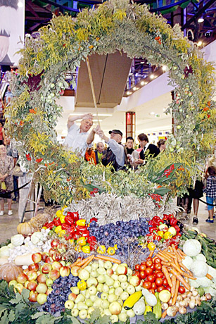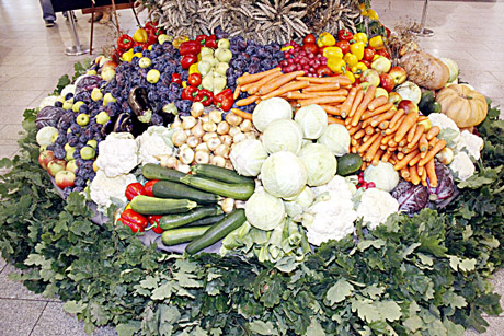Kokia kompozicija būtų be šiųmečio lietuviško derliaus! Idėją įgyvendinti padėjo Radviliškio rajono Šeduvos krašto ūkininkai – derliaus stalui jie padovanojo 471 kilogramą lietuviškų vaisių ir daržovių: slyvų, obuolių, kriaušių, agurkų, paprikų, morkų, cukinijų.