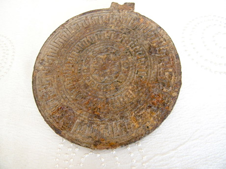 Apvalus metalinis dirbinys buvo išraižytas įvairiais ornamentais, pačiame viduriuke buvo tarytum saulė ar gėlės žiedas.