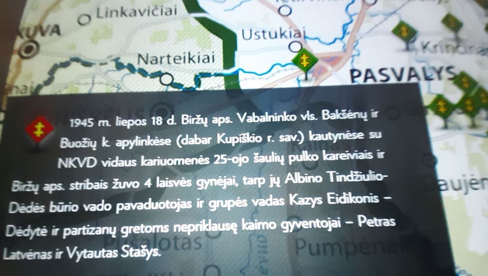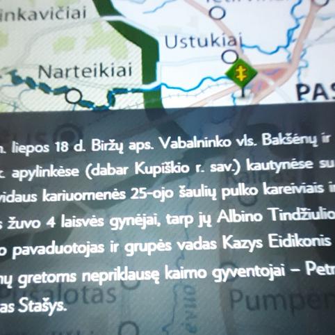 Pasirinkę partizanų temą, susipažins su pasipriešinimo okupantams kovų žemėlapiu. Jame pristatoma „Dariaus ir Girėno“ rinktinė, kovojusi Šiaurės Rytų Lietuvos krašte. Pasak L. Kuncytės, žemėlapyje sužymėtos visos žinomos vietos, kur vyko mūšiai, susidūrimai. Žemėlapyje kiekviena vėliavėlė žymi vietovę, ją paspaudus, galima sužinoti, kas ir kada ten įvyko. Pasirinkus rubriką „Atsiminimai“ galima rasti buvusių tremtinių atsiminimus, o skyrelyje „Istorijos“ – muziejaus darbuotojų straipsnius.