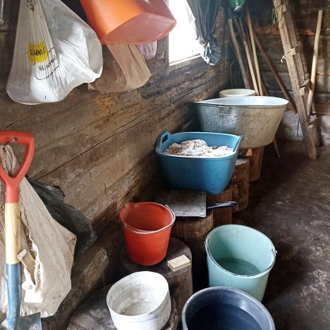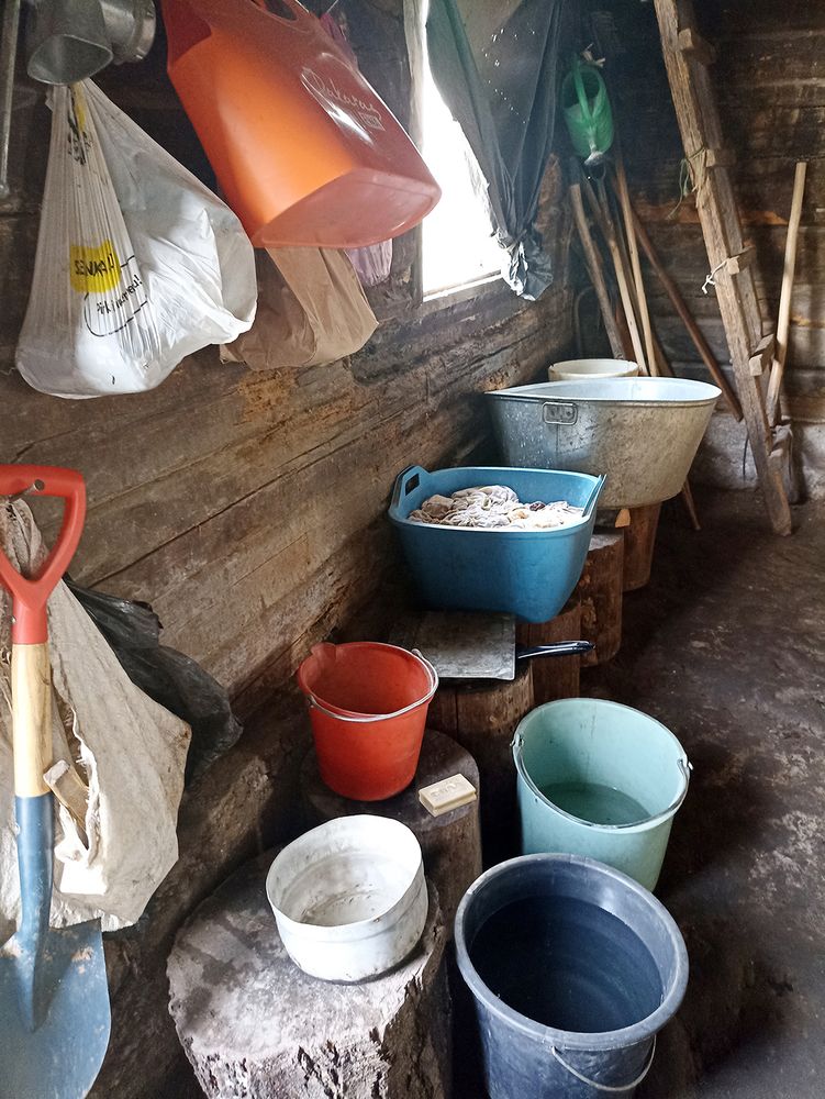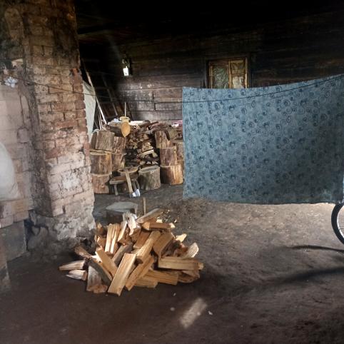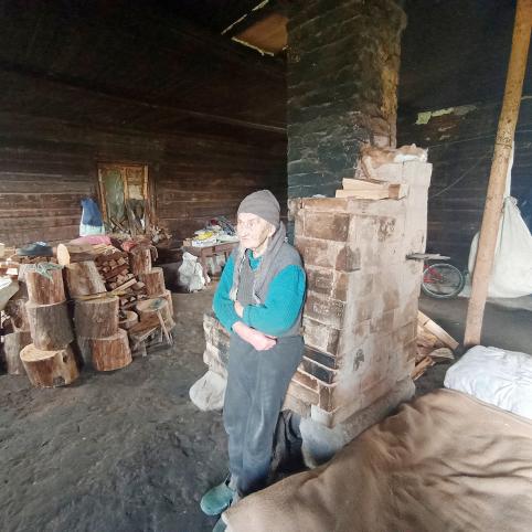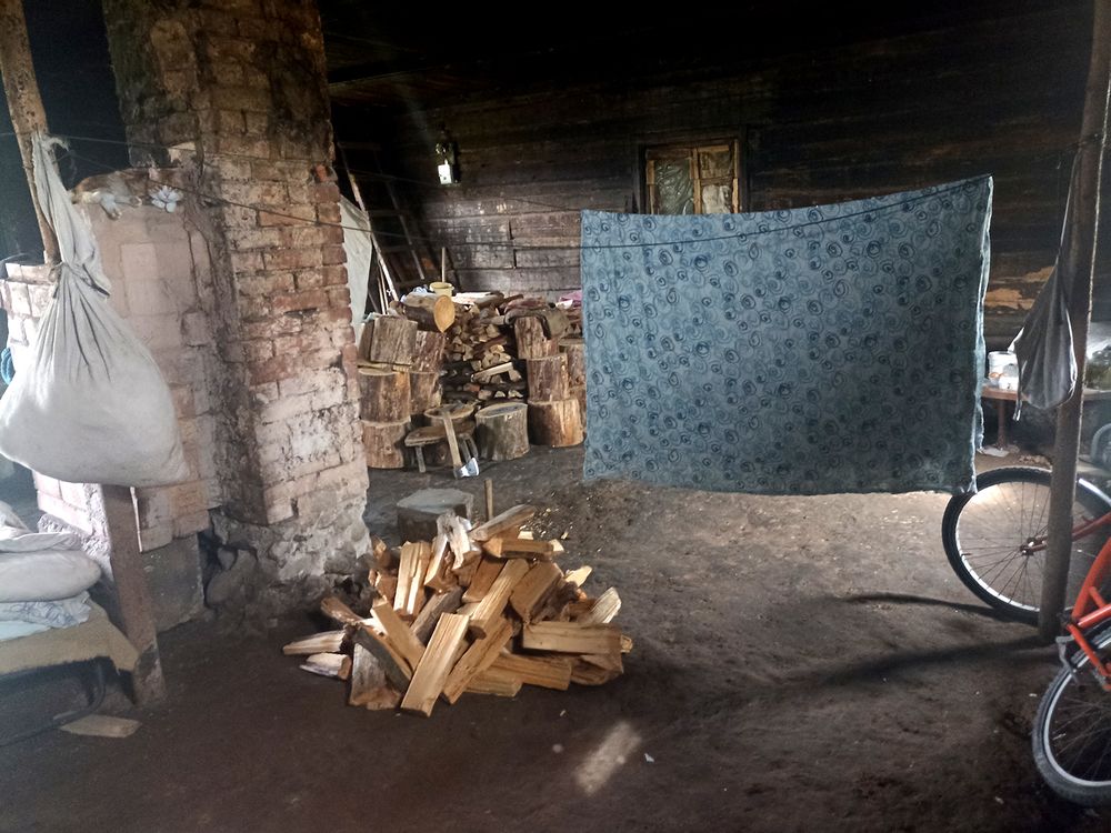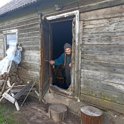 „Prašom, užeikite“, – kviečia močiutė, atrišusi lauko durų virvę, mat šios yra be rankenų. Ji neseniai užsikūrė vidury trobos pamūrytą krosnį, šildo vandenį ir ruošiasi skalbti – įvairaus dydžio induose užmerktas žlugtas. „Šitą krosnį pamūrijęs meistras jau miręs, o aš va, dar gyvenu“,- šypteli senolė. Dievulis jai išties davė stiprią sveikatą – močiutė buityje apsitvarko pati – ir aslą pašluoja, ir valgyti išsiverda, ir dar malkų prisikapoja, tik kad sunkiai jos skyla... Dar ir daržą pati pasisėjo.