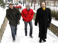 VYRAI: Į redakciją užsukę Gintautas Lukošaitis (iš kairės į dešinę), muzikantai Gintautas ir Kęstutis Gascevičiai, pareiškia: „Menininkai ar ne menininkai, nesvarbu. Čia jungiasi vyrai“.