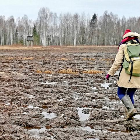 Ėjimas laukais nėra lengvas – batai aplimpa molėta žeme, ieškome sausesnių vietų ir stengiamės nepaslysti. Priekyje turim orientyrą – medžiotojų bokštelį.